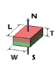 Большинство прямоугольных неодимовых магнитов имеют Северный и Южный Полюс на двух больших противоположных поверхностях, как на рисунке. Некоторые размеры магнитов имеют намагниченность в продольном направлении, они специально помечены.